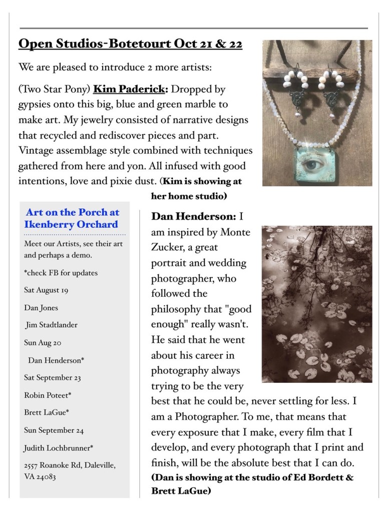 Update for August 4, 2023 Posted byOpen Studios - Botetourt 08/04/2023 Leave a comment on Update for August 4, 2023 Share this: Click to share on X (Opens in new window) X Click to share on Facebook (Opens in new window) Facebook Click to email a link to a friend (Opens in new window) Email Like Loading... Related Published by Open Studios - Botetourt Artists' studio tour, the last weekend of October, each year in Botetourt County, Virginia. View more posts