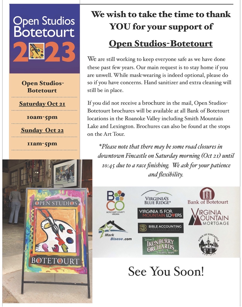 Update for October 17 Posted byOpen Studios - Botetourt 10/17/2023 Leave a comment on Update for October 17 Share this: Click to share on X (Opens in new window) X Click to share on Facebook (Opens in new window) Facebook Click to email a link to a friend (Opens in new window) Email Like Loading... Related Published by Open Studios - Botetourt Artists' studio tour, the last weekend of October, each year in Botetourt County, Virginia. View more posts